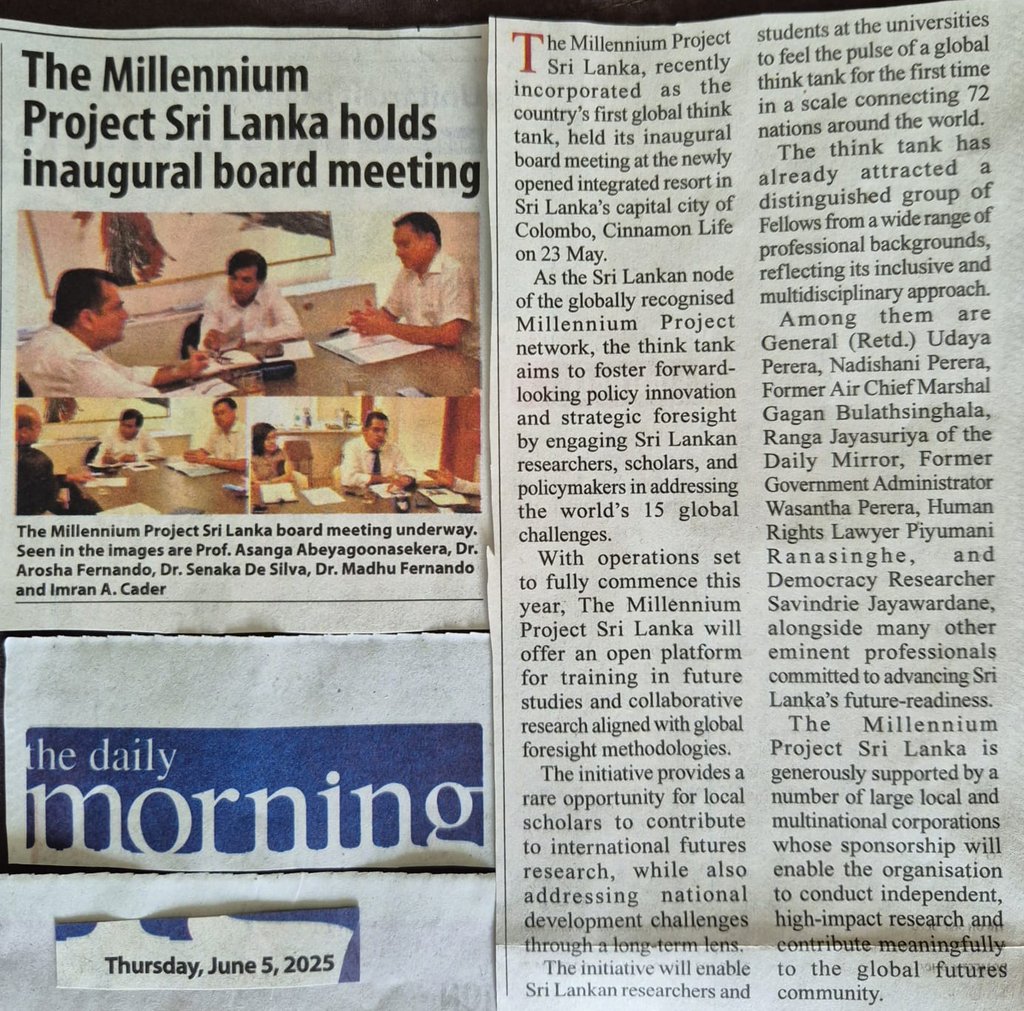 With operations set to fully commence this year, The Millennium Project Sri Lanka will offer an open platform for training in futures studies and collaborative research aligned with global foresight methodologies. The initiative provides a rare opportunity for local scholars to contribute to international futures research, while also addressing national development challenges through a long-term lens.