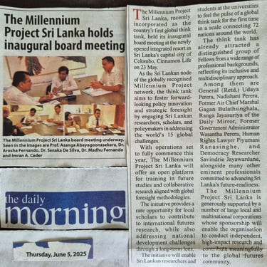 Colombo, Sri Lanka (5th June 2025) – The Millennium Project Sri Lanka, recently incorporated as the country’s first global think tank, held its inaugural board meeting at the newly opened Integrated Resort in Sri Lanka’s capital City of Colombo, 'Cinnamon Life' on 23rd May 2025. As the Sri Lankan node of the globally recognized Millennium Project network, the think tank aims to foster forward-looking policy innovation and strategic foresight by engaging Sri Lankan researchers, scholars, and policymakers in addressing the world’s 15 Global Challenges.